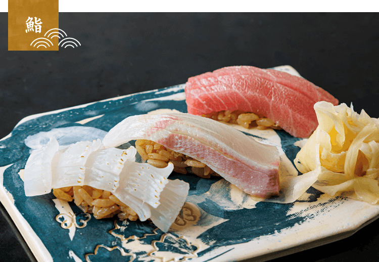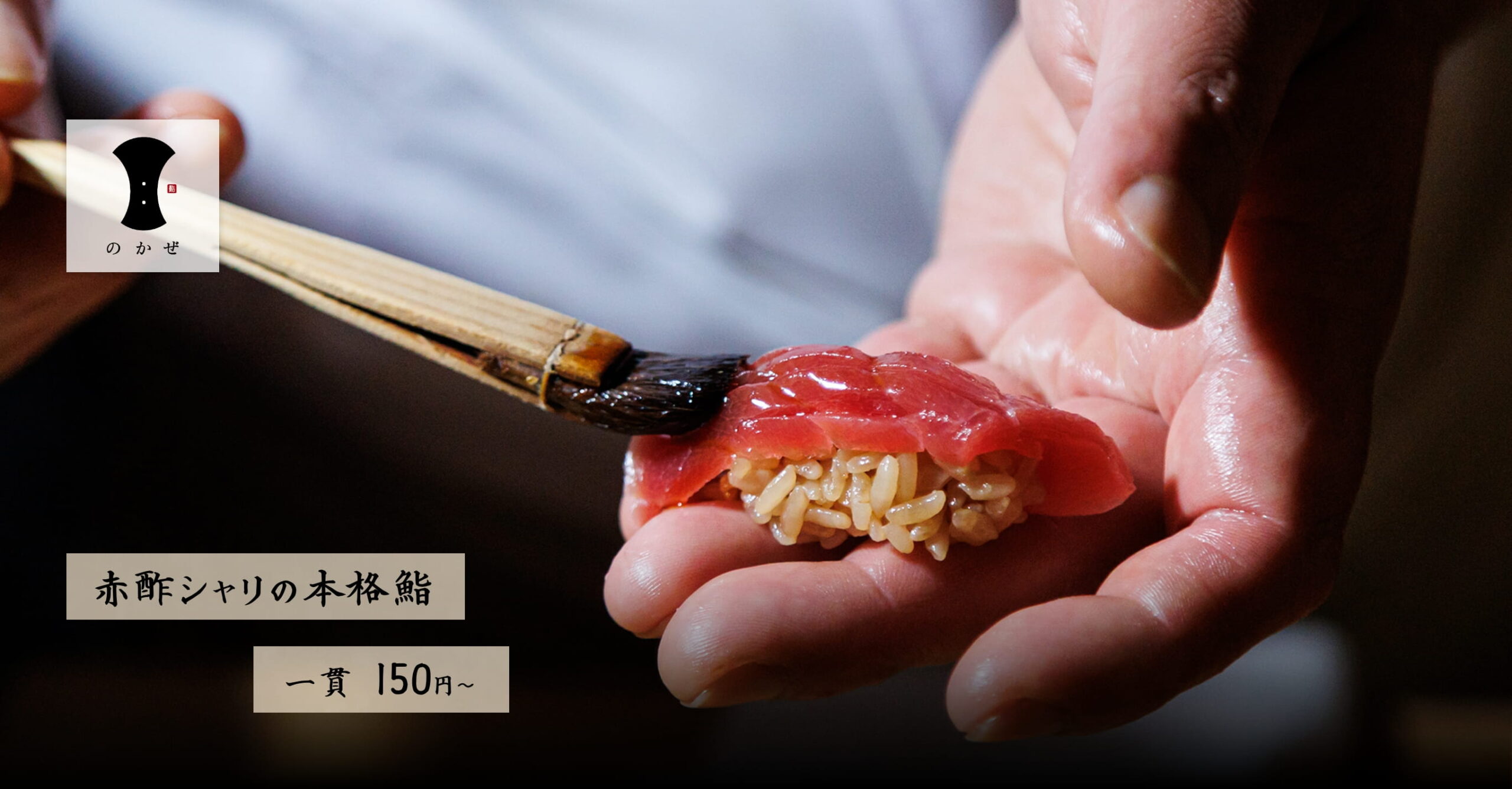 「鮨のかぜ」のシャリは、赤酢で仕立てたこまシャリ。ほのかな酸味と深い旨みが、旬の魚介の味わいを引き立て、口の中でほどけるように溶け合います。魚の種類や脂の乗りを見極め、一貫ごとに仕事を変える職人技が光ります。一貫150円から、多彩なネタを愉しめます。