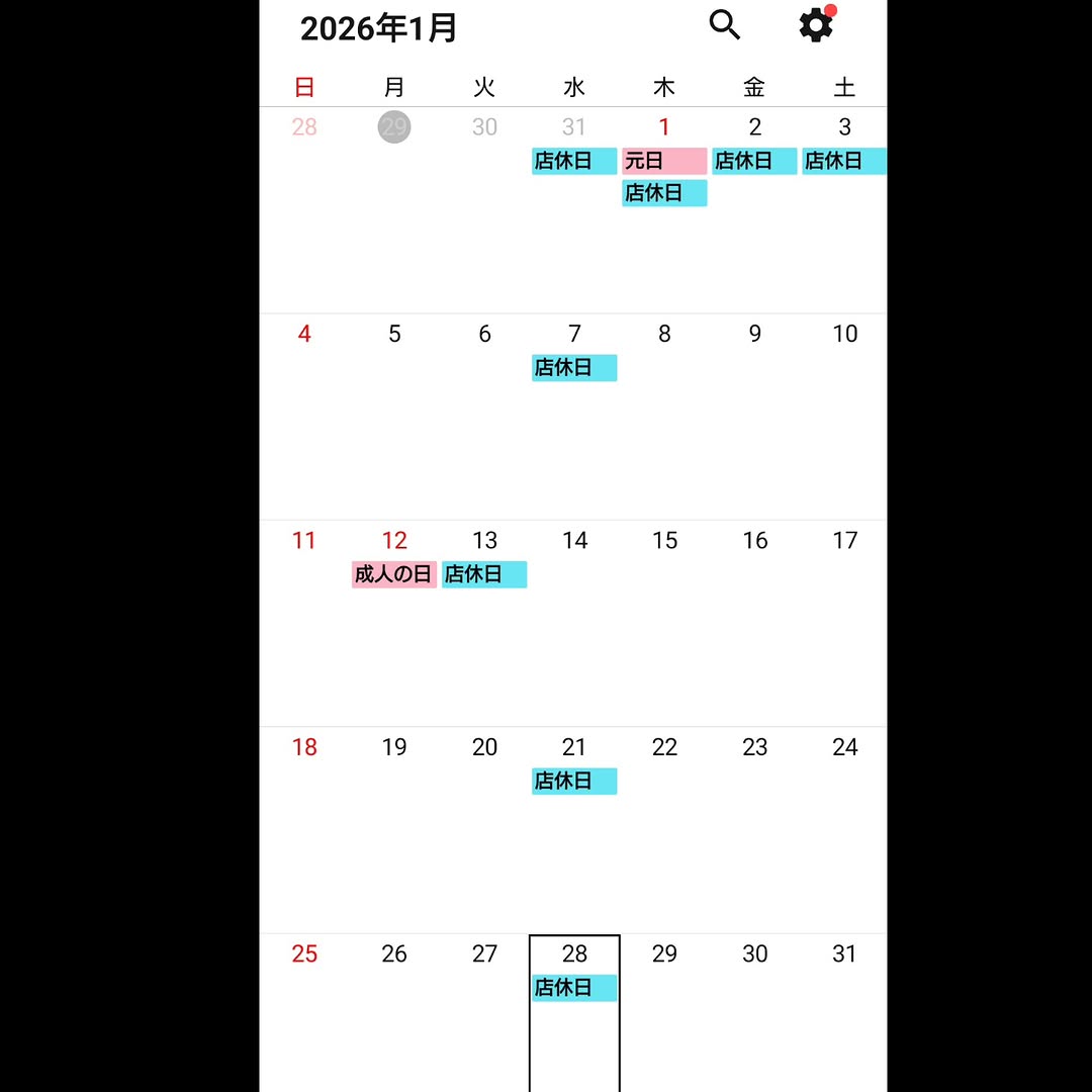 1月のお休みは13日火曜日と7,21,28日水曜日とさせて頂いております。