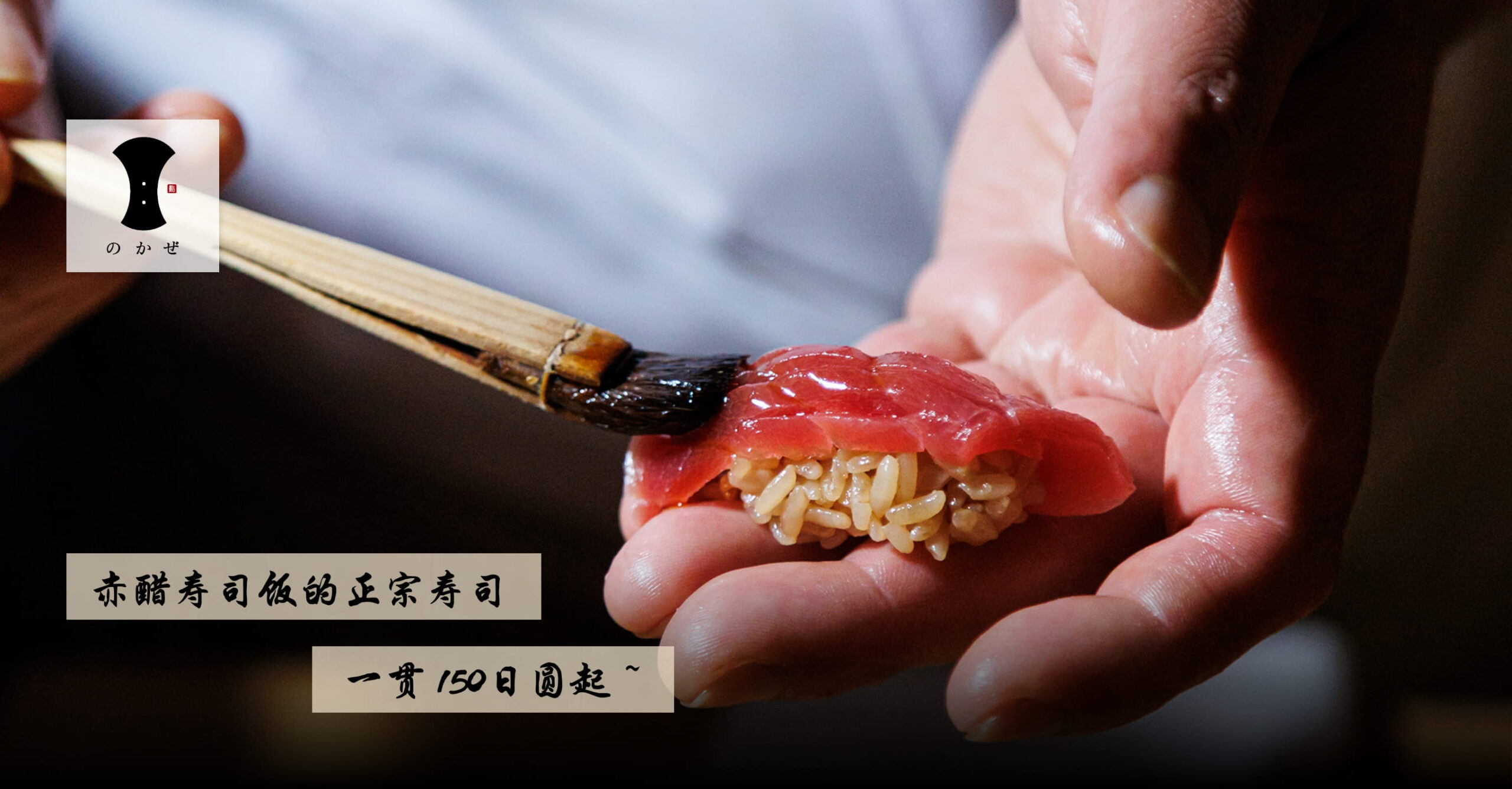 「鮨NOKAZE」的寿司饭采用赤醋制作的小份寿司饭。淡淡的酸味与深厚的鲜味,能衬托当季海鲜的美味,入口即化。职人会根据鱼的种类与脂肪量调整每贯的手法,展现精湛技艺。从一贯150日圆起,即可享受多样化的食材。