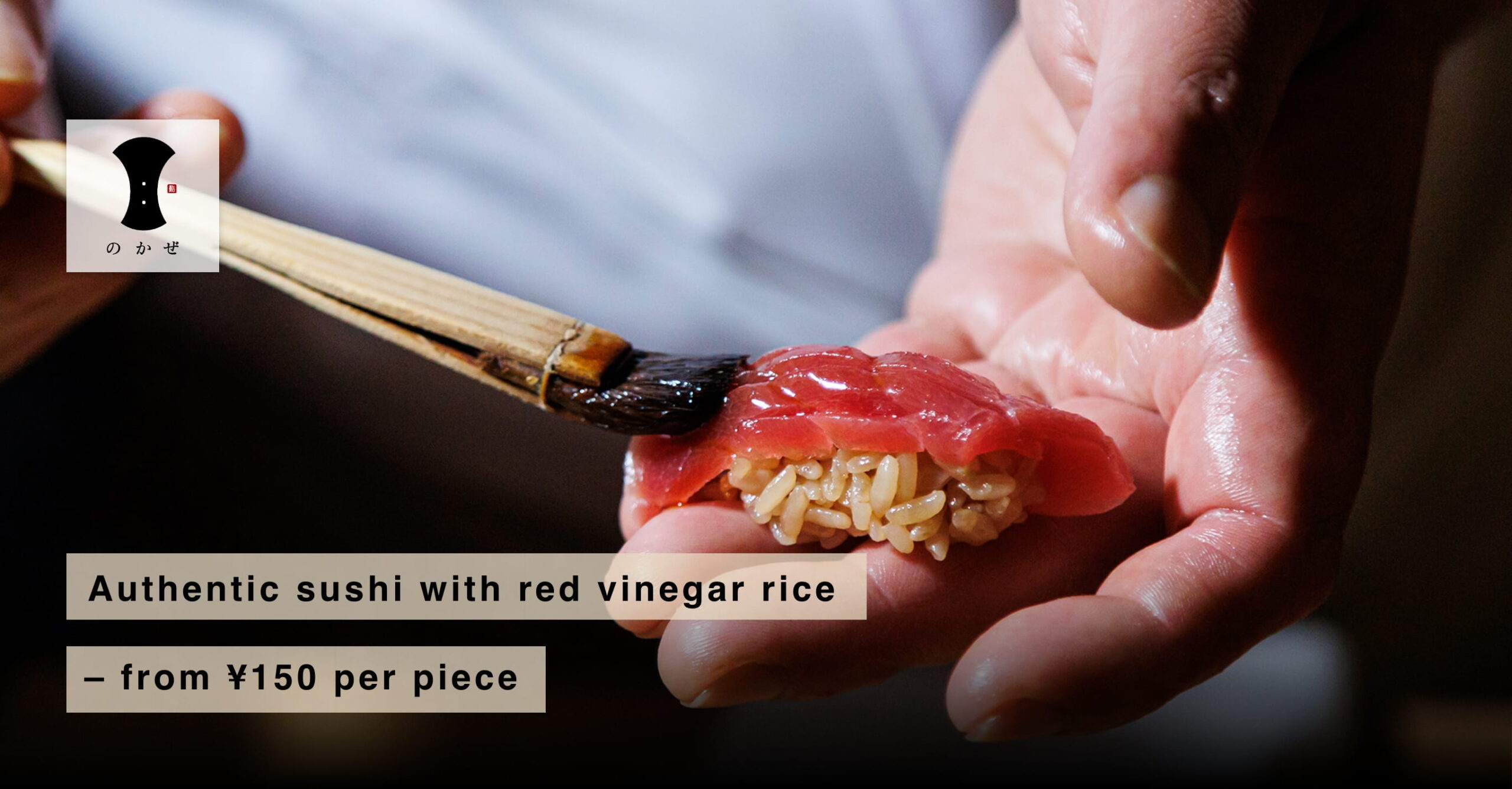 At “Sushi NOKAZE,” the rice is prepared with red vinegar in small portions called “koma-shari.” The subtle acidity and rich umami enhance the flavor of seasonal seafood, melting together smoothly in your mouth. Skilled chefs adjust their technique for each piece according to the type and fat content of the fish, showcasing their craftsmanship. Starting from ¥150 per piece, you can enjoy a wide variety of toppings.